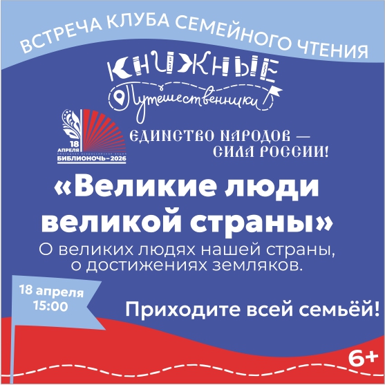 18 апреля в 15.00 в Московском доме книги на Новом Арбате состоится встреча клуба семейного чтения «Книжные путешественники»: «Великие люди великой страны». Встреча пройдёт в рамках детского варианта всероссийской акции «Библионочь-2026».