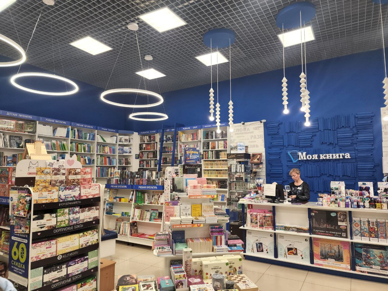 Мы посмотрели книжные магазины «Моя книга» в Саратове и Энгельсе. Все магазины сети имеют свою концепцию и фирменный стиль: это очень светлые пространства, оформленные в сине-белой цветовой гамме. Освещению уделено особое внимание: все стеллажи и выкладки хорошо просматриваются благодаря разноуровневому освещению. Много лицевых выкладок, что выгодно отличает «Мою книгу» от других магазинов. Удобная и легкая конструкция лестниц на колесиках является органичной частью интерьера и позволяет получить доступ к верхним полкам.