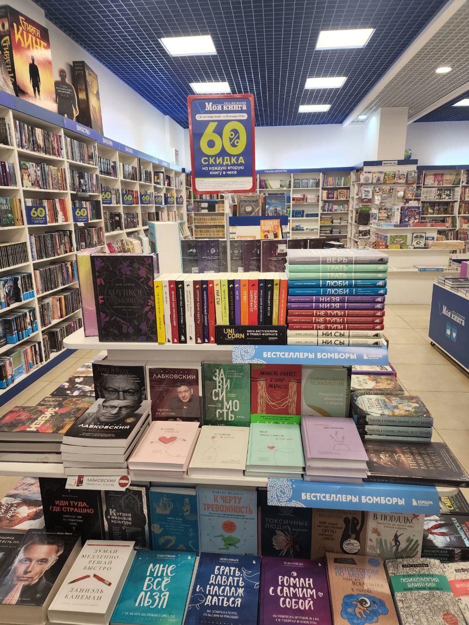 Сейчас в магазине проходит несколько акций: «В книгах живет успех», 60% скидка на каждую вторую книгу в чеке.