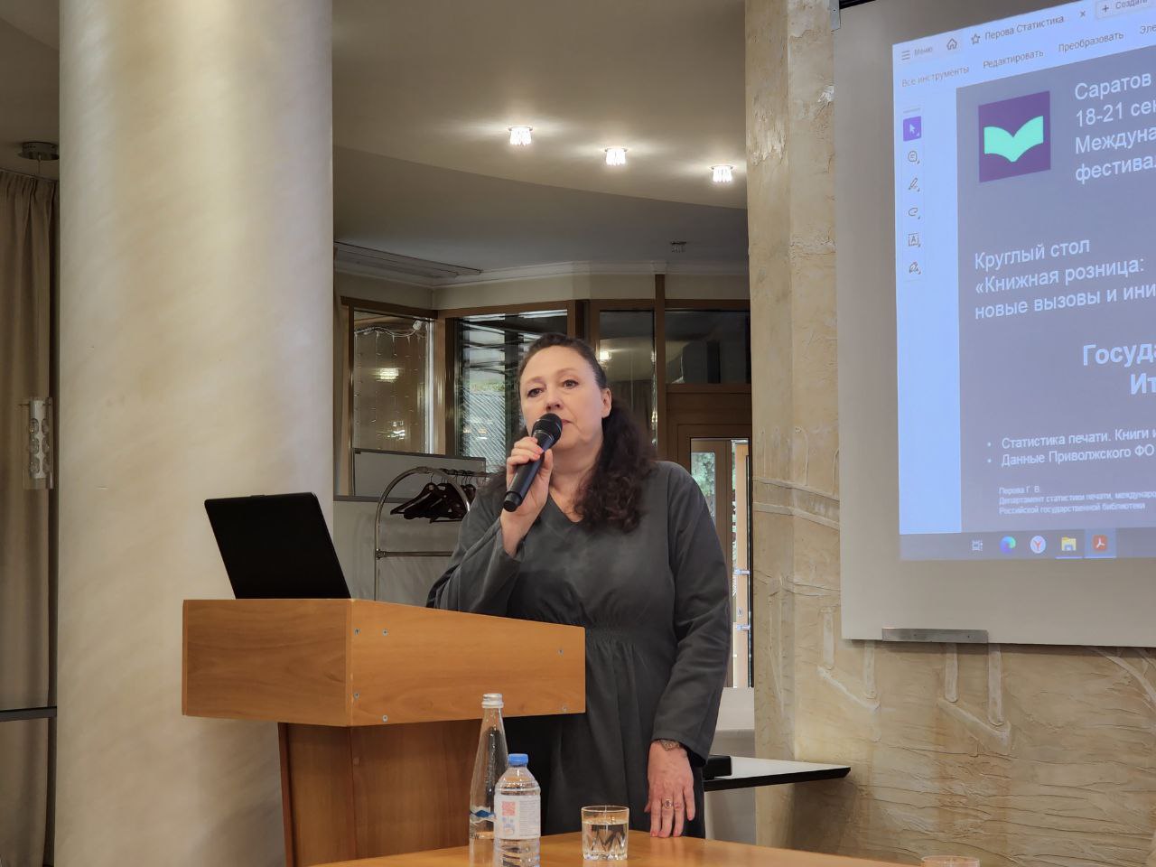 Галина Перова, директор Департамента статистики печати, международной стандартной нумерации и контроля комплекса «Российская книжная палата» РГБ, представила данные государственной статистики печати за I полугодие 2025 года. Среди городов Приволжского Федерального округа Саратов занимает лидирующие позиции по количеству наименований книг, вышедших за 6 месяцев 2025 года: 433 наименования общим тиражом 234,5 тыс. экз. Всего в регионе работает 34 издательства, верхние строчки рейтинга занимают «Лицей», «Амирит», «Вверх», «Саратовская государственная юридическая академия», «Новый ветер».