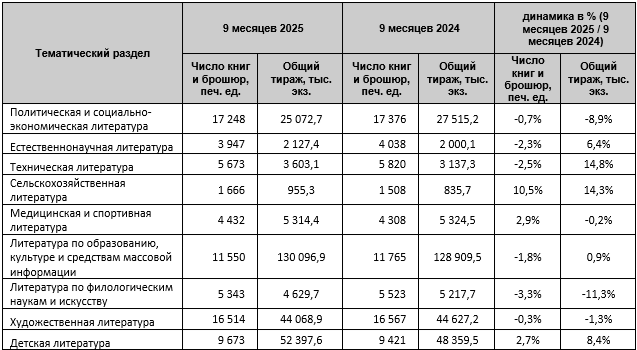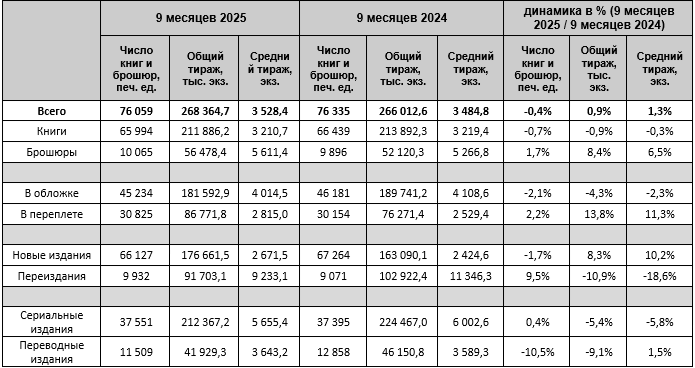 Суммарный выпуск книг и брошюр за 9 месяцев 2025 года составил 76 059 названий, что на 0,4% ниже данного показателя за аналогичный период 2024 года. Совокупный тираж составил 268,4 млн экземпляров, это на 0,9% выше данного показателя за 9 месяцев 2024 года. Средний тираж показал незначительный рост к прошлому году – на 1,3%, составив 3 528,4 экземпляров.