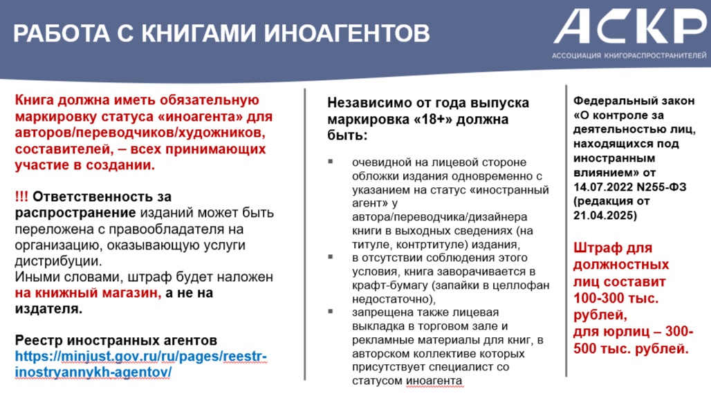 - запрещена также лицевая выкладка в торговом зале и рекламные материалы для книг, в авторском коллективе которых присутствует специалист со статусом иноагента.