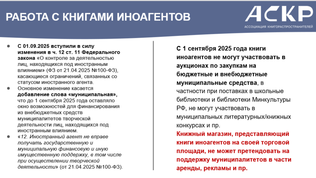С 1 сентября 2025 года книги иноагентов не могут участвовать в аукционах по закупкам на бюджетные и внебюджетные муниципальные средства, в частности при поставках в школьные библиотеки и библиотеки Минкультуры РФ, не могут участвовать в муниципальных литературных/книжных конкурсах и пр. Книжный магазин, представляющий книги иноагентов на своей торговой площади, не может претендовать на поддержку муниципалитетов в части аренды, рекламы и пр.